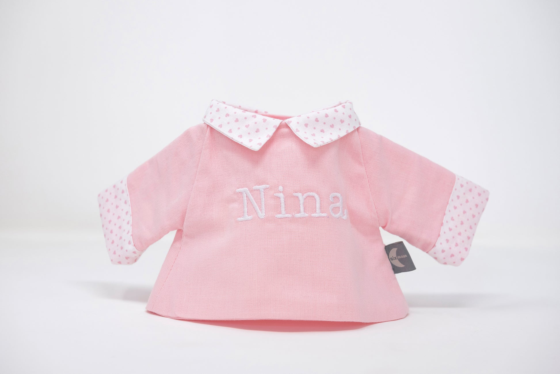 Camisa rosa con cuello y puños a corazocitos rosas. Nombre bordado en blanco.